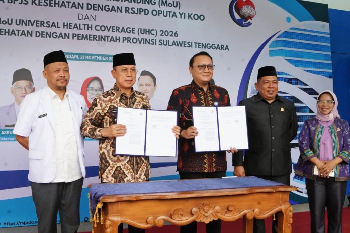 Kendari — Pemerintah Kota Kendari menunjukkan komitmennya dalam mendukung peningkatan layanan kesehatan masyarakat dengan menghadiri penandatanganan Memorandum of Understanding (MoU) antara Rumah Sakit Jantung dan Pembuluh Darah Oputa Yi Koo (RS Jantung Sultra) dan BPJS Kesehatan. Kehadiran Pemkot diwakili oleh Asisten I Setda Kota Kendari, Maman Firmansyah, S.STP., M.M., dalam kegiatan yang berlangsung pada Jumat (21/11/2025).