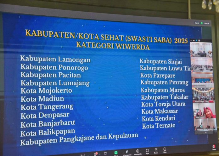 Kendari – Pemerintah Kota Kendari kembali menorehkan prestasi membanggakan di tingkat nasional setelah berhasil mempertahankan Penghargaan Kota Sehat Kategori Swasti Saba Wiwerda Tahun 2025. Pengumuman resmi penghargaan tersebut disampaikan oleh Kementerian Kesehatan dan Kementerian Dalam Negeri melalui pertemuan daring yang diikuti langsung Wali Kota Kendari, dr. Hj. Siska Karina Imran, SKM, bersama Tim Kota Sehat di Ruang Rapat Wali Kota Kendari, Jumat (28/11/2025).